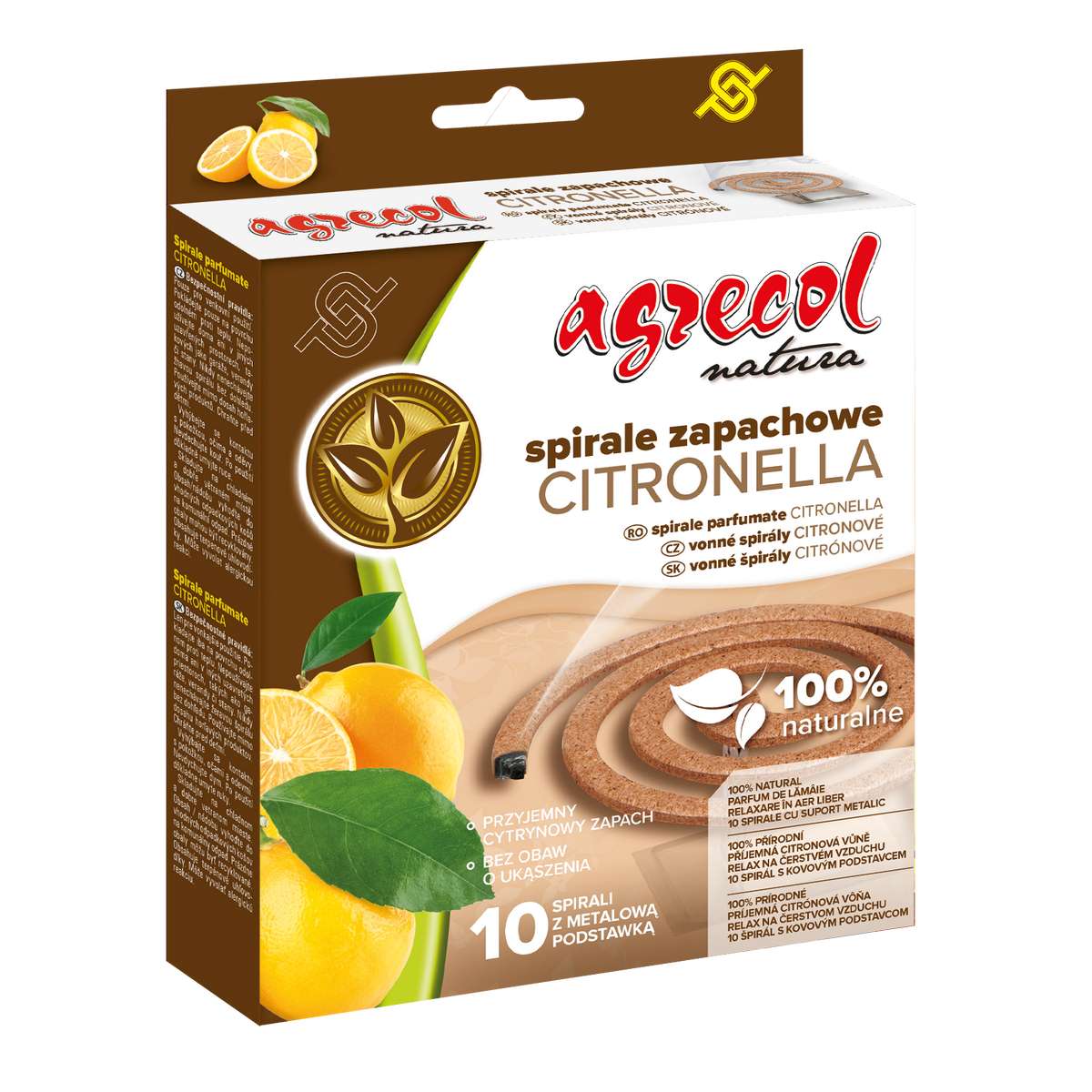 Spirale zapachowe Citronella o przyjemnym cytrynowym aromacie, do stosowania na tarasach, w ogrodach i innych przestrzeniach otwartych. Produkt z serii Agrecol Natura. Każda spirala uwalnia zapach przez około 4 godziny. Ciesz się z przebywania na świeżym powietrzu bez obaw o ukąszenia. W 100% naturalne spirale zapachowe o przyjemnym cytrynowym aromacie.