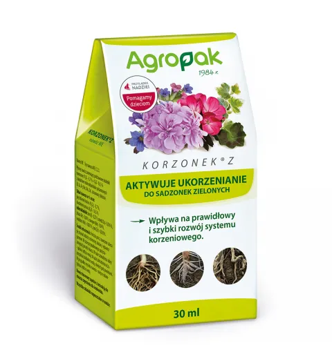 Korzonek Z jest preparatem do stosowania podczas ukorzeniania zielonych sadzonej roślin ozdobnych. Wpływa na prawidłowy i szybki rozwój systemu korzeniowego. Zawiera aktywatory procesów ukorzeniania oraz substancje łagodzące stres roślin. Użycie preparatu Korzonek Z eliminuje potrzebę stosowania innych ukorzeniaczy. Nawóz stosowany zgodnie z instrukcja nie stwarza zagrożenia dla środowiska.