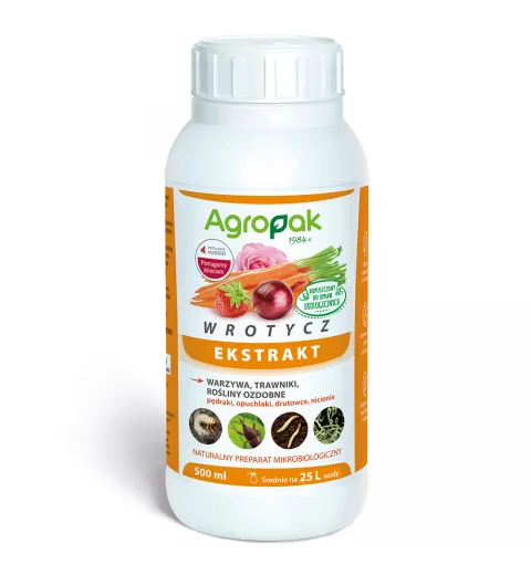 Wrotycz to naturalny preparat mikrobiologiczny do ochrony trawników, upraw roślin ozdobnych, owocowych i warzywnych przed występującymi w glebie szkodnikami, takimi jak pędraki, nicienie, opuchlaki i drutowce. Produkt na bazie ekstraktu z procesu fermentacji wrotyczu z bakteriami lactobacillus i bacillus, stwarza nieatrakcyjne warunki do bytowania szkodników. Swoim charakterystycznym zapachem oraz działaniem składników aktywnych ekstraktu zmusza je do wyjścia na powierzchnie, gdzie giną i są zjadane przez ptactwo. Preparat można stosować w formie oprysku lub podlewania, na wilgotną glebę, w dni pochmurne lub wieczorem, od wiosny do jesieni. Zaleca się wykonanie trzech zabiegów w odstępach 7 – 10 dni. Produkt jest bezpieczny dla ludzi, zwierząt i środowiska. Stanowi doskonałą alternatywę (lub uzupełnienie) konwencjonalnych środków chemicznych. Jest dopuszczony do stosowania w uprawach ekologicznych.