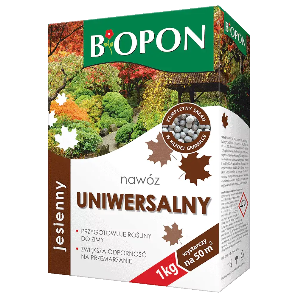 Jesienny nawóz uniwersalny do nawożenia doglebowego jest wieloskładnikowym granulatem o jednolitej konsystencji (kompletny skład w każdej granulce). Obniżona zawartość azotu nie pobudza już przyrostu roślin, a duża porcja potasu zwiększa odporność na wymarzanie. Nawóz długotrwale uzupełnia niedobory minerałów w glebie i tworzy zapasy składników odżywczych potrzebnych do rozpoczęcia wegetacji w następnym sezonie.