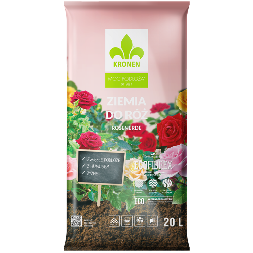 KRONEN® Ziemia do róż to doskonałe specjalistyczne podłoże do sadzenia i przesadzania róż oraz innych intensywnie rosnących krzewów wymagających żyznego, stabilnego podłoża. Wyprodukowana jest na bazie frakcji torfu wysokiego o różnym stopniu rozkładu z ECOFIBREX® (dodatek z włókien drzewnych). Podłoże zawiera glinkę wulkaniczną, która stabilizuje warunki wodne podłoża, magazynuje składniki pokarmowe oraz ma właściwości buforowe.