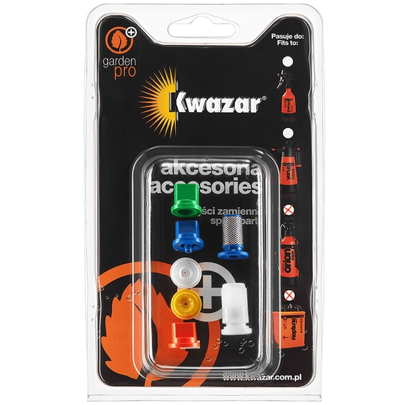 Zestaw zawiera 6 dysz o różnym wydatku cieczy, filtr końcówki lancy oraz filtr cylindryczny zapobiegający zapychaniu się rozpylacza. Wybór dysz pozwala na dobór rozpylacza w zależności od potrzeb użytkownika, rodzaju zabiegu i używanego środka chemicznego.