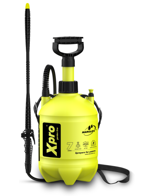 Xpro 7 litrowy ręczny opryskiwacz ciśnieniowy posiada zbiornik z 3 letnią gwarancją, wykonany z polietylenu dzięki temu jest on lekki, wytrzymały co gwarantuje bezawaryjną wieloletnią pracę. Wyposażony jest w wydajną pompę co znacznie skraca czas uzyskania ciśnienia roboczego. Posiada odporną na uszkodzenia lancę o długości 44 cm zakończoną dyszą MR1.5-90° z regulacją kąta strumienia, to pozwala w dowolny sposób dostosować kąt oprysku do rodzaju przeprowadzanych zabiegów. Zawiera zawór dozujący z blokadą przycisku dlatego podczas prowadzenia oprysków nie ma konieczności ciągłego trzymania przycisku, dzięki temu nawet długa praca nie jest męcząca. Posiada wąż z potrójnym oplotem 130 cm wzmocniony sprężyną, która chroni go przed załamaniem oraz regulowany pas naramienny. Ciśnienie robocze 0,25 MPa jest optymalne niezależnie od rodzaju przeprowadzanych oprysków. Umieszczony na zbiorniku pasek poziomu cieczy z czytelną podziałką ułatwia określenie ilości cieczy. Wszystkie podzespoły użyte w opryskiwaczu są oryginalne i występują w innych seriach opryskiwaczy co sprawia, że wyróżnia je wysoka jakość i bezawaryjność. Możliwość dokupienia dowolnych akcesoriów takich jak przedłużacz czy lanca 3m, osłona herbicydowa czy dysze pozwalają na dostosowanie opryskiwacza odpowiednio do tego jak będzie się zmieniał rodzaj i zakres przeprowadzanych oprysków.