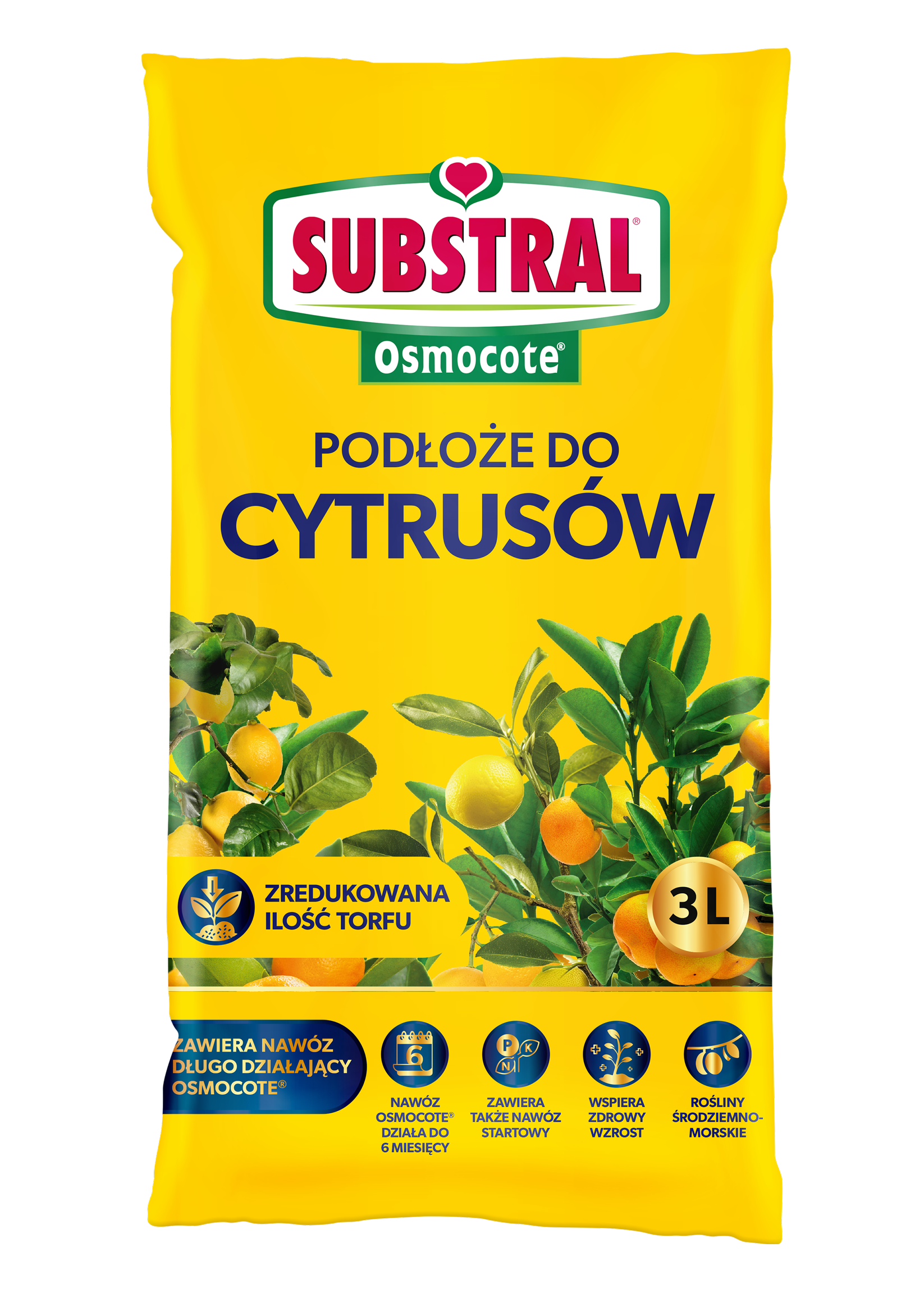 Substral Osmocote® Podłoże do Cytrusów to gotowe podłoże idealne do sadzenia i przesadzania cytrusów oraz innych roślin śródziemnomorskich, takich jak oliwki, oleandry i hibiskusy. Zawiera nawóz długodziałający Osmocote®, który wspiera formowanie korzeni i dalszy wzrost roślin, a odczyn pH 5,5-6,0 zapewnia optymalne warunki rozwoju. Skład podłoża obejmuje torf, korę i włókna drzewne, co poprawia strukturę gleby i wspiera zrównoważony rozwój. To podłoże zapewnia roślinom idealne warunki do zdrowego wzrostu, jednocześnie dbając o środowisko dzięki redukcji torfu na rzecz ekologicznych surowców.
