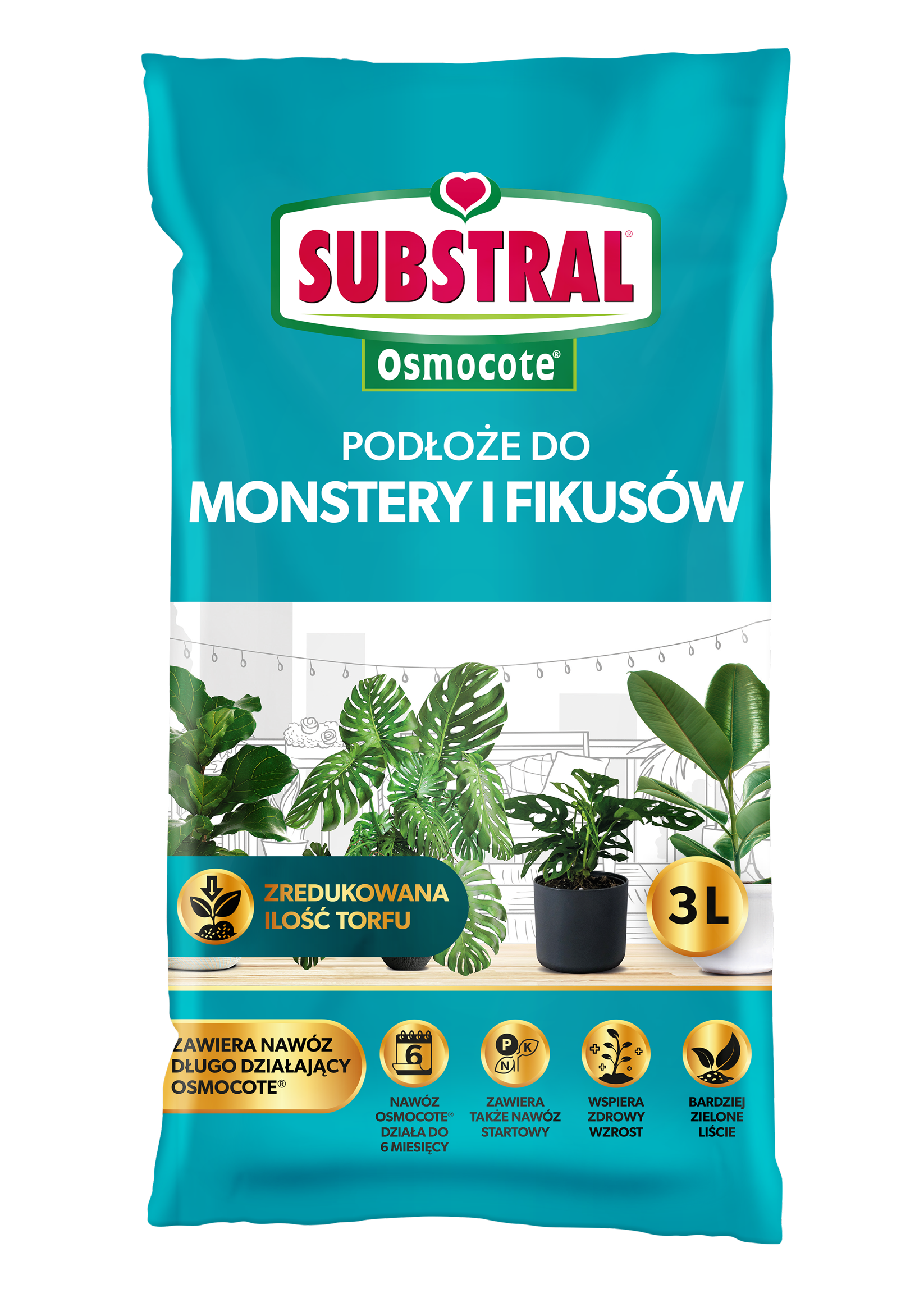 Łatwy sposób na domową dżunglę! SUBSTRAL do roślin zielonych to podłoże przeznaczone do przesadzania i sadzenia wszystkich gatunków roślin domowych. Podłoże jest mieszaniną torfu wysokiego (utrzymuje powietrze) i niskiego (utrzymuje wilgoć). Podłoże wzbogacono mieszanką nawozów – Osmocote i startowego. Skład podłoża zawiera wszystkie ważne składniki odżywcze oraz zapewnia zdrowy i energiczny wzrost roślin.