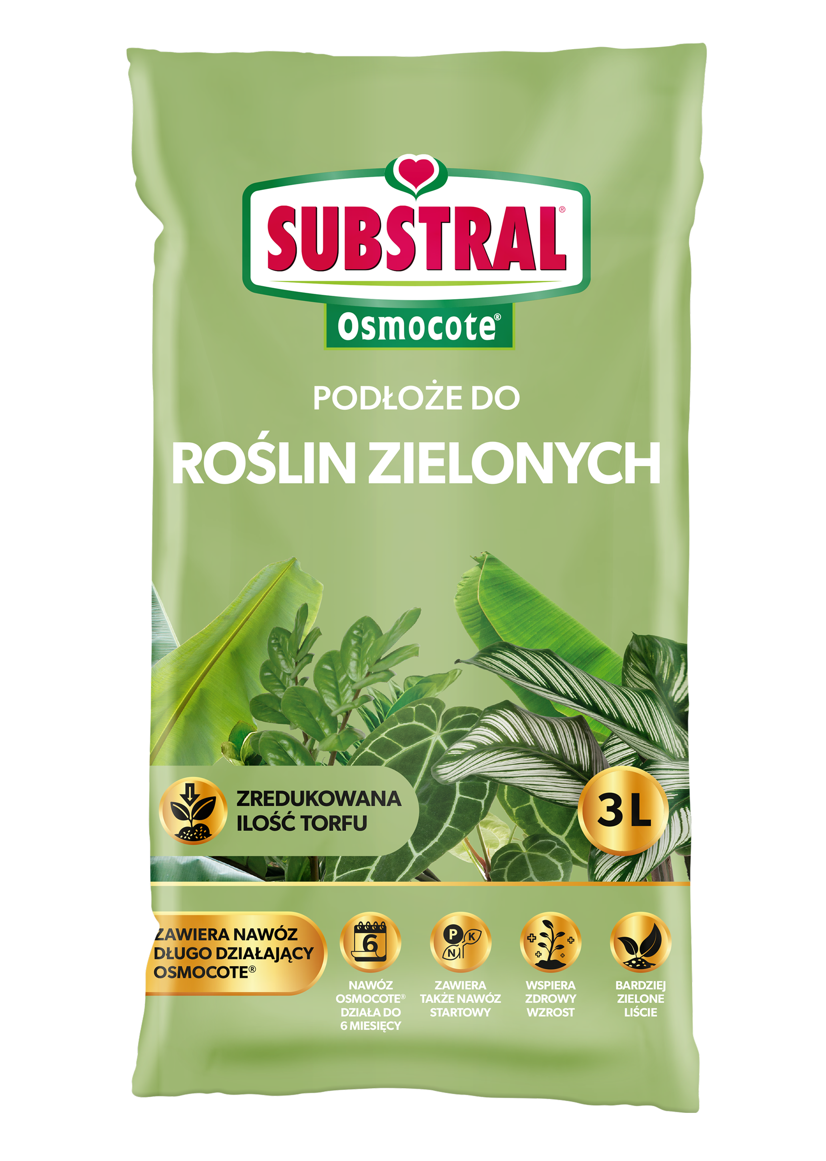 Substral Osmocote® Podłoże do Zielonych Roślin Ozdobnych to idealna mieszanka do przesadzania i sadzenia domowych roślin zielonych, takich jak palma, fikus, monstera czy zamiokulkas. Zawiera nawóz długodziałający Osmocote®, który wspiera formowanie korzeni i rozwój roślin, a odczyn pH 5,7-6,2 zapewnia optymalne warunki wzrostu. Skład podłoża, obejmujący torf, korę i włókna drzewne, poprawia strukturę gleby i wspiera zrównoważony rozwój. Podłoże to zapewnia roślinom doskonałe warunki do pełnego rozwoju, dbając jednocześnie o środowisko dzięki redukcji torfu na rzecz ekologicznych surowców.