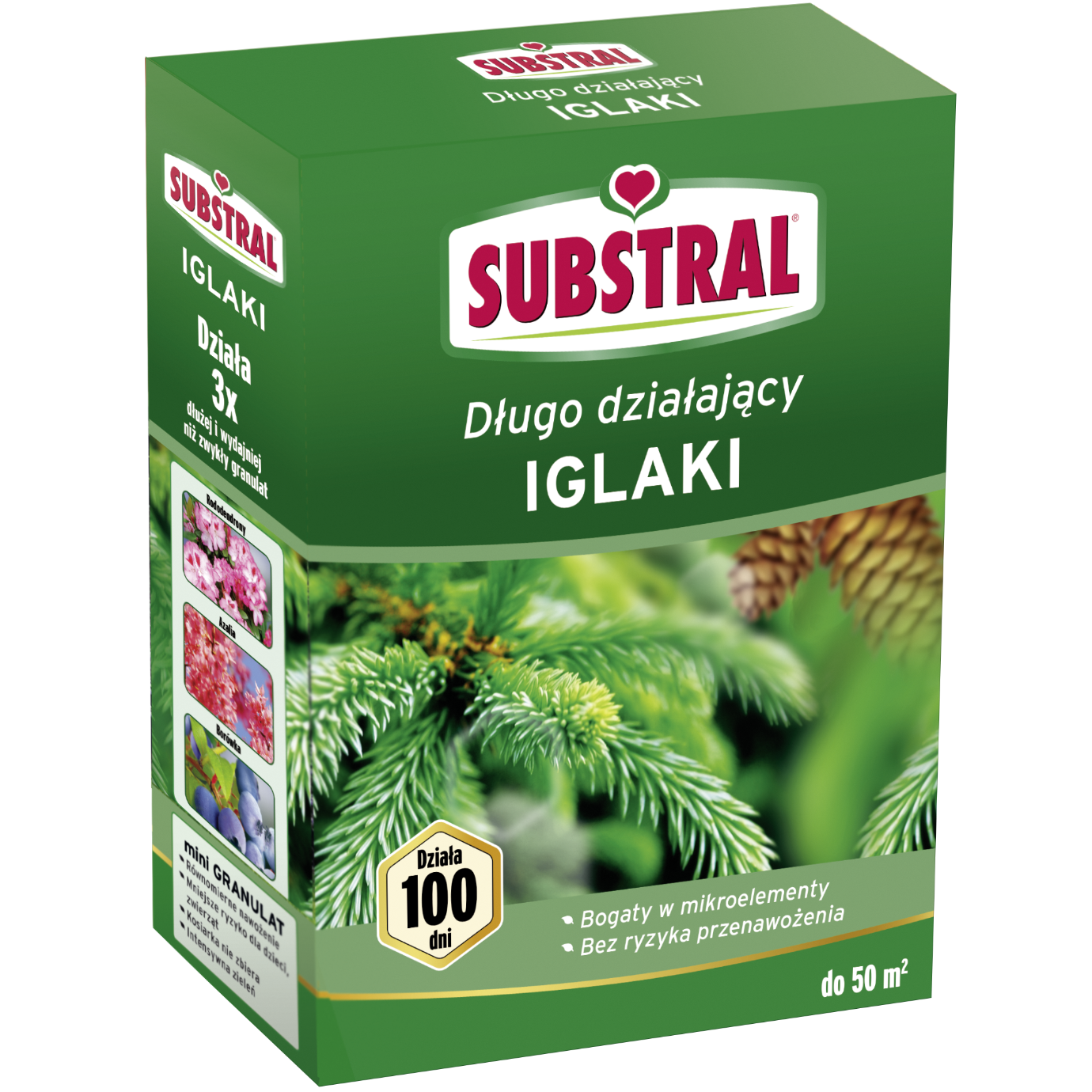 Doskonałe efekty w postaci wspaniale kwitnących roślin i bujnie rosnących iglaków uzyskuje się dzięki ciągłemu dokarmianiu roślin w jednakowej dawce przez cały sezon. Substral 100 dni to długo działający nawóz do iglaków, który stosuje się przy sadzeniu i nawożeniu już rosnących iglaków i innych roślin kwaśnolubnych. Najlepsze efekty uzyskamy nawożąc iglaki, rododendrony, azalie, kamelie, magnolie, hortensje, wrzosy, borówki amerykańskie przez cały sezon. Odpowiednio dobrane składniki nawozu 100 dni spełniają wymagania tych roślin i gwarantują widoczne efekty w sezonie. Nawóz po rozsypaniu i podlaniu powoli rozpuszcza się i przechodzi do wierzchniej warstwy gleby, gdzie pozostaje przez okres do 100 dni i jest pobierany przez korzenie. Uwalnianie nawozu jest sterowane przez czynniki naturalne. Rośliny otrzymują codziennie małą, dostosowana do ich potrzeb dawkę składników odżywczych. Dzięki temu nawóz działa bardzo długo, bo ponad 3 miesiące – wystarczy więc jedno lub dwa nawożenia na sezon, bez ryzyka przenawożenia. Nawóz jest bardzo wydajny, rośliny potrafią wykorzystać nawet do 70% składników pokarmowych w porównaniu do zwykłych granulatów, gdzie sięga to zaledwie 25%.