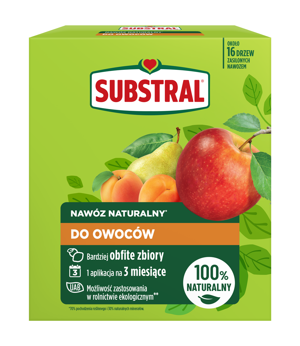 SUBSTRAL® Nawóz naturalny do Owoców to w pełni naturalny produkt, wzbogacony organicznym minerałem zeolitem. Dzięki temu składnikowi, nawóz skutecznie zatrzymuje składniki pokarmowe w glebie, co poprawia ich wchłanianie przez rośliny. Długotrwała formuła odżywia rośliny aż przez 3 miesiące, co prowadzi do obfitszych plonów. Skład nawozu oparty jest na materiałach roślinnych oraz naturalnych minerałach, a brak składników pochodzenia zwierzęcego eliminuje nieprzyjemny zapach.