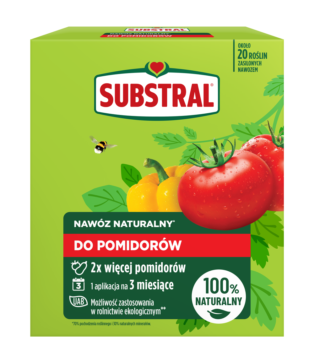 SUBSTRAL® Nawóz naturalny do Pomidorów to całkowicie naturalny produkt wzbogacony organicznym minerałem zeolitem. Dzięki temu składnikowi, nawóz zatrzymuje składniki pokarmowe w glebie, co poprawia ich wchłanianie przez rośliny. Długotrwała formuła odżywia rośliny aż przez 3 miesiące, co przyczynia się do uzyskania obfitszych plonów. Skład nawozu oparty jest na materiałach roślinnych i wzbogaconych naturalnych minerałach, a brak substancji pochodzenia zwierzęcego eliminuje nieprzyjemny zapach.
