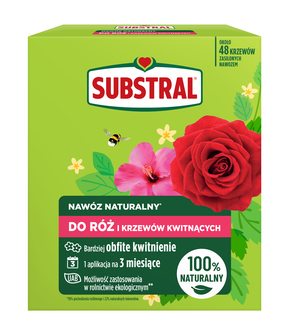 SUBSTRAL® Nawóz naturalny do Róż to całkowicie naturalny nawóz, wzbogacony organicznym minerałem zeolitem. Połączenie ze składnikami nawozu efektywnie zatrzymuje składniki pokarmowe w glebie, co poprawia ich wchłanianie. Dzięki długotrwałej formule, rośliny są odżywiane przez trzy miesiące, co prowadzi do bardziej obfitych plonów. Produkt składa się z materiałów roślinnych i naturalnych minerałów, a jego formuła nie zawiera substancji pochodzenia zwierzęcego, co zapobiega nieprzyjemnemu zapachowi.
