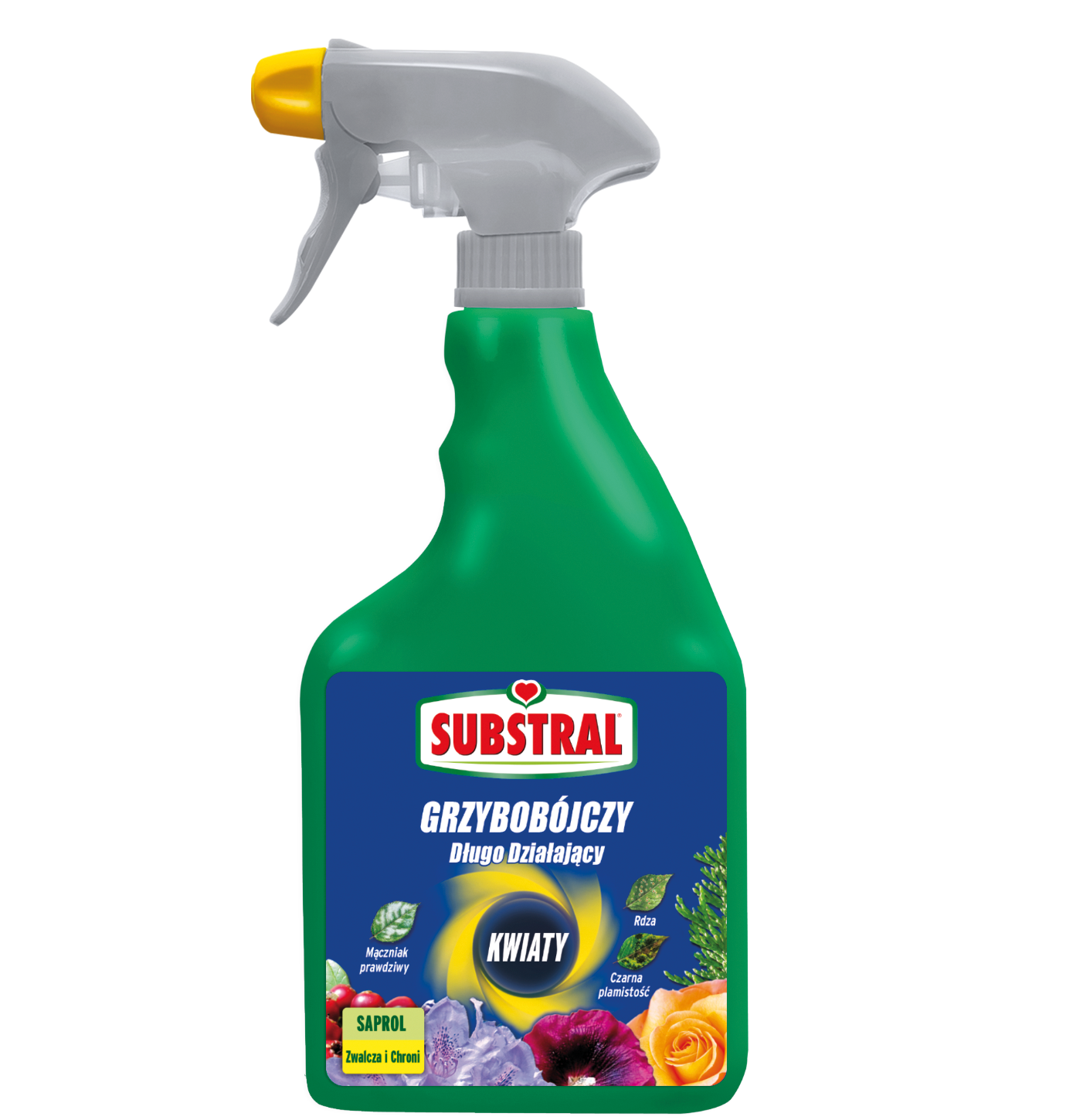 Substral Saprol – Dom, Ogród, Balkon. Środek grzybobójczy do róż, rododendronów, hortensji, kwiatów i roślin kwitnących. Gotowy do bezpośredniego użycia. Działa układowo. Wykorzystywany interwencyjnie i zapobiegawczo. Działa natychmiast po zastosowaniu oraz zapewnia ochronę przed nowymi infekcjami do 3 tygodni. Zwalcza czarną plamistość liści, rdzę, mączniaka prawdziwego. Bardzo szeroki obszar zastosowania od domu, przez balkon, aż po ogród.