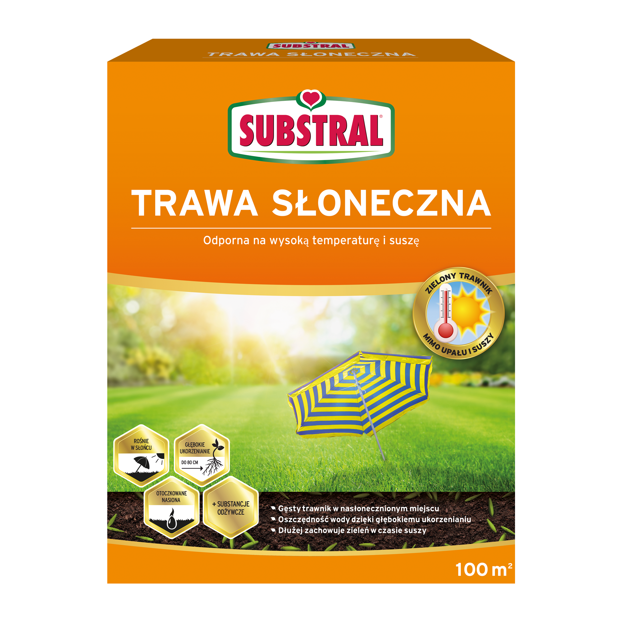 Substral Trawa Słoneczna to wysokiej jakości mieszanka nasion traw do miejsc nasłonecznionych, ale także do suchych, półzacienionych miejsc w ogrodzie. Wyjątkowo oporna na upał i suszę, dzięki zastosowaniu specjalnych gatunków traw z dodatkiem otoczki, która chroni przed wydziobaniem nasion przez ptaki oraz zapewnia szybszy i lepszy wzrost trawy w miejscach nasłonecznionych.